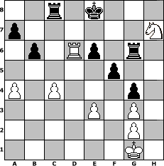 game notation in PGN-format [Event "Fernschachmeisterschaft Sfr. Heimersheim 2007"] [Site "www.myChess.de"] [Date "2007.01.21"] [Round "2"] [White "stefan"] [Black "Devine"] [ECO "A46"] [WhitemyELO "1756"] [BlackmyELO "2040"] [Result "0-1"] [TimeControl "10/2592000"] [WhiteDays "12"] [BlackDays "24"] [MyChessNo "31879"] 1. d4 Nf6 2. Nf3 e6 3. c4 b6 4. Bg5 Bb7 5. e3 h6 6. Bh4 g5 7. Bg3 Ne4 8. Bd3 Nxg3 9. hxg3 Bg7 10. Nc3 Nc6 11. O-O h5 12. a3 h4 13. d5 Ne5 14. Nxe5 Bxe5 15. dxe6 dxe6 16. Be4 Qxd1 17. Raxd1 Bxe4 18. Nxe4 Bxb2 19. a4 hxg3 20. fxg3 g4 21. Rd2 Be5 22. Rfd1 f5 23. Ng5 Rh6 24. Rd7 Rg6 25. Nh7 Bd6 26. R7xd6 cxd6 27. Rxd6 Rc8 0-1 position notation in FEN-format 2r1k3/p6N/1p1Rp1r1/5p2/P1P3p1/4P1P1/6P1/6K1 - - - 1 28 Captured white pieces: ![]() ![]() ![]() ![]() ![]() ![]() ![]() ![]() ![]() ![]() ![]() ![]() ![]() ![]() ![]() Captured black pieces: ![]() ![]() ![]() ![]() ![]() ![]() ![]() ![]() ![]() ![]() ![]() ![]() ![]() ![]() ![]() Click on a captured piece in order to display the desired move!