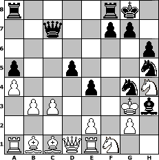 game notation in PGN-format [Event "Winteranfang 2017"] [Site "www.myChess.de"] [Date "2017.12.21"] [Round "1"] [White "Lohl"] [Black "Cuibono"] [ECO "B00"] [WhitemyELO "1845"] [BlackmyELO "2211"] [Result "0-1"] [TimeControl "10/3456000"] [WhiteDays "35"] [BlackDays "40"] [MyChessNo "110761"] 1. e4 Nc6 2. d4 e5 3. d5 Nce7 4. Nf3 Ng6 5. Bc4 Bc5 6. O-O Nf6 7. Nbd2 O-O 8. c3 a5 9. a4 d6 10. h3 c6 11. Ng5 Ba7 12. dxc6 bxc6 13. b3 d5 14. exd5 cxd5 15. Bd3 Nf4 16. Bb1 h6 17. Ngf3 Qc7 18. Re1 Bxh3 19. Nh4 Bxf2+ 20. Kxf2 Ng4+ 21. Kg3 e4 22. Nf1 Nh5+ 0-1 position notation in FEN-format r4rk1/2q2pp1/7p/p2p3n/P3p1nN/1PP3Kb/4P1P1/RBBQRN2 - - - 2 23 Captured white pieces: Captured black pieces: Click on a captured piece in order to display the desired move!