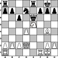 game notation in PGN-format [Event "Hitzeschlacht"] [Site "www.myChess.de"] [Date "2009.08.13"] [Round "1"] [White "ChrisKoenig"] [Black "beowulf"] [ECO "C36"] [WhitemyELO "1548"] [BlackmyELO "1368"] [Result "1-0"] [TimeControl "10/864000"] [WhiteDays "10"] [BlackDays "10"] [MyChessNo "58263"] 1. e4 e5 2. f4 exf4 3. Nf3 d5 4. exd5 Nf6 5. Nc3 c6 6. d4 Bb4 7. Bxf4 Nxd5 8. Bd2 O-O 9. Be2 Bg4 10. O-O Re8 11. Nxd5 Bxd2 12. Nf6+ Qxf6 13. Qxd2 Nd7 14. Ne5 Qe6 15. Bxg4 1-0 position notation in FEN-format r3r1k1/pp1n1ppp/2p1q3/4N3/3P2B1/8/PPPQ2PP/R4RK1 - - - 0 15 Captured white pieces: Captured black pieces: Click on a captured piece in order to display the desired move!