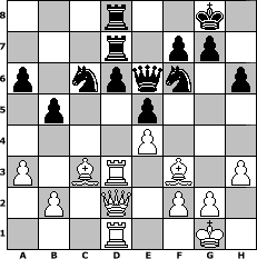 game notation in PGN-format [Event "Karnevalsstress"] [Site "www.myChess.de"] [Date "2009.02.15"] [Round "1"] [White "Plaidroller"] [Black "martinus"] [ECO "B33"] [WhitemyELO "1799"] [BlackmyELO "1877"] [Result "1/2-1/2"] [TimeControl "10/1728000"] [WhiteDays "55"] [BlackDays "55"] [MyChessNo "52790"] 1. e4 c5 2. Nf3 Nc6 3. d4 cxd4 4. Nxd4 Nf6 5. Nc3 a6 6. Be2 e5 7. Nb3 Bb4 8. Bf3 O-O 9. Bd2 d6 10. O-O Be6 11. a3 Bxc3 12. Bxc3 Qb6 13. Qe2 Bxb3 14. cxb3 Qxb3 15. Rad1 Rad8 16. Rd3 Qe6 17. Rfd1 Rd7 18. Qd2 Rfd8 19. h3 h6 20. Kh1 b5 21. Kg1 1/2-1/2 position notation in FEN-format 3r2k1/3r1pp1/p1npqn1p/1p2p3/4P3/P1BR1B1P/1P1Q1PP1/3R2K1 - - - 1 21 Captured white pieces: Captured black pieces: Click on a captured piece in order to display the desired move!