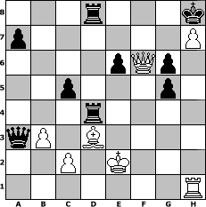 game notation in PGN-format [Event "Abwrackturnier"] [Site "www.myChess.de"] [Date "2009.04.16"] [Round "1"] [White "reisender"] [Black "Joschi"] [ECO "B12"] [WhitemyELO "1379"] [BlackmyELO "1549"] [Result "1-0"] [TimeControl "10/864000"] [WhiteDays "40"] [BlackDays "35"] [MyChessNo "54875"] 1. e4 c6 2. d4 d5 3. Bf4 dxe4 4. Nc3 Nf6 5. Bxb8 Rxb8 6. Qe2 Bf5 7. O-O-O e6 8. f3 exf3 9. Nxf3 Be7 10. h3 b5 11. Ne5 Qb6 12. g4 Bg6 13. Nxg6 hxg6 14. g5 Nh5 15. Qg4 b4 16. Na4 Qa5 17. b3 Bxg5+ 18. Kb1 Be7 19. Re1 Nf6 20. Qf4 O-O 21. h4 Nd5 22. Qc1 Bf6 23. Re4 Nc3+ 24. Nxc3 bxc3 25. h5 g5 26. h6 g6 27. a4 Qxa4 28. Qe3 Qb4 29. Kc1 Qa3+ 30. Kd1 Rbd8 31. Qxc3 c5 32. Qf3 Bxd4 33. Bd3 Kh7 34. Ke2 Rd5 35. Rxd4 Rxd4 36. Qf6 Rg8 37. Qxf7+ Kh8 38. h7 Rgd8 39. Qf6# 1-0 position notation in FEN-format 3r3k/p6P/4pQp1/2p3p1/3r4/qP1B4/2P1K3/7R - - - 2 39 Captured white pieces: ![]() ![]() ![]() ![]() ![]() ![]() ![]() ![]() ![]() ![]() ![]() ![]() ![]() ![]() ![]() Captured black pieces: ![]() ![]() ![]() ![]() ![]() ![]() ![]() ![]() ![]() ![]() ![]() ![]() ![]() ![]() ![]() Click on a captured piece in order to display the desired move!