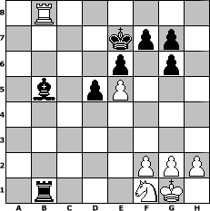 game notation in PGN-format [Event "QGD: Orthodox Verteidigung"] [Site "www.myChess.de"] [Date "2008.08.11"] [Round "1"] [White "neve"] [Black "ujack1961"] [ECO "D65"] [WhitemyELO "1466"] [BlackmyELO "1683"] [Result "0-1"] [TimeControl "10/2592000"] [WhiteDays "120"] [BlackDays "120"] [MyChessNo "47030"] 1. d4 d5 2. c4 e6 3. Nc3 Nf6 4. Bg5 Be7 5. e3 O-O 6. Nf3 Nbd7 7. Rc1 c6 8. Qc2 a6 9. cxd5 Nxd5 10. Bxe7 Nxe7 11. Bd3 Ng6 12. O-O Nf6 13. Bxg6 hxg6 14. Rfd1 Qa5 15. e4 b5 16. a3 b4 17. axb4 Qxb4 18. e5 Nd5 19. Nxd5 cxd5 20. Rd3 Rb8 21. Nd2 Qxb2 22. Qd1 Bd7 23. Ra1 Rfc8 24. Nb3 Rc2 25. Rd2 Rxd2 26. Nxd2 Qxd4 27. Rxa6 Rb2 28. Qf3 Kf8 29. Ra8+ Ke7 30. Qa3+ Qb4 31. Qxb4+ Rxb4 32. Rg8 Rb2 33. Nf1 Bb5 34. Rb8 Rb1 0-1 position notation in FEN-format 1R6/4kpp1/4p1p1/1b1pP3/8/8/5PPP/1r3NK1 - - - 6 35 Captured white pieces: ![]() ![]() ![]() ![]() ![]() ![]() ![]() ![]() ![]() ![]() ![]() ![]() ![]() ![]() ![]() Captured black pieces: ![]() ![]() ![]() ![]() ![]() ![]() ![]() ![]() ![]() ![]() ![]() ![]() ![]() ![]() ![]() Click on a captured piece in order to display the desired move!