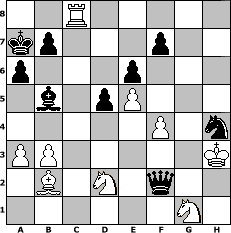 game notation in PGN-format [Event "Reiner Geist"] [Site "www.myChess.de"] [Date "2011.07.30"] [Round "1"] [White "UPS"] [Black "espero"] [ECO "C02"] [WhitemyELO "1695"] [BlackmyELO "1658"] [Result "0-1"] [TimeControl "10/1728000"] [WhiteDays "28"] [BlackDays "78"] [MyChessNo "75322"] 1. e4 e6 2. d4 d5 3. e5 c5 4. c3 Nc6 5. Nf3 Qb6 6. Be2 Nh6 7. b3 cxd4 8. cxd4 Bb4+ 9. Kf1 Nf5 10. Bb2 h5 11. a3 Be7 12. Qd3 Bd7 13. Nbd2 a6 14. g3 g5 15. h3 O-O-O 16. Kg2 g4 17. Ng1 Ncxd4 18. hxg4 hxg4 19. Rxh8 Rxh8 20. Bxg4 Bb5 21. Qc3+ Kb8 22. Rc1 Bg5 23. f4 Bxf4 24. gxf4 Nh4+ 25. Kg3 Ndf5+ 26. Bxf5 Nxf5+ 27. Kf3 Nh4+ 28. Kg3 Rg8+ 29. Kh3 Qf2 30. Qc7+ Ka8 31. Qc8+ Rxc8 32. Rxc8+ Ka7 0-1 position notation in FEN-format 2R5/kp3p2/p3p3/1b1pP3/5P1n/PP5K/1B1N1q2/6N1 - - - 1 33 Captured white pieces: Captured black pieces: Click on a captured piece in order to display the desired move!