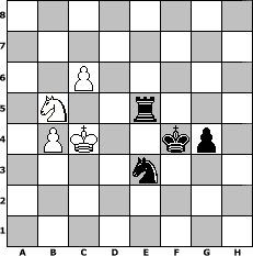 game notation in PGN-format [Event "el ajedrez"] [Site "www.myChess.de"] [Date "2006.02.04"] [Round "1"] [White "Andylein1989"] [Black "crca108"] [ECO "C60"] [WhitemyELO "1385"] [BlackmyELO "1402"] [Result "0-1"] [TimeControl "10/2592000"] [WhiteDays "30"] [BlackDays "30"] [MyChessNo "22258"] 1. e4 e5 2. Nf3 Nc6 3. Bb5 Nge7 4. O-O g6 5. d4 exd4 6. Nxd4 Bg7 7. Nxc6 bxc6 8. Bc4 O-O 9. Re1 d5 10. Bd3 Qd6 11. c3 a5 12. Be3 Be5 13. g3 Bh3 14. Be2 h5 15. exd5 cxd5 16. Bh6 Rfb8 17. Bc1 Qc6 18. Bxh5 Qf6 19. Bg4 Bxg4 20. Qxg4 Kg7 21. Bg5 Qd6 22. b3 f6 23. Be3 Rh8 24. Bd4 Rh5 25. Bxe5 fxe5 26. Nd2 e4 27. Rad1 Nf5 28. Nxe4 Qc6 29. Ng5 Rah8 30. Ne6+ Kf6 31. Nf4 Rg5 32. Re6+ Qxe6 33. Qxg5+ Kxg5 34. Nxe6+ Kg4 35. Nxc7 Kh3 36. Rxd5 Rc8 37. Nb5 Re8 38. Rd1 Re2 39. a3 Rb2 40. b4 axb4 41. axb4 Nh6 42. Rf1 Ng4 43. f3 Nxh2 44. Rf2 Rb1+ 45. Rf1 Nxf1 46. Kf2 Nxg3 47. Ke3 Nf5+ 48. Kd3 Kg3 49. Ke4 Re1+ 50. Kd3 Re3+ 51. Kc4 Kxf3 52. Kd5 g5 53. c4 Kf4 54. c5 g4 55. c6 Re5+ 56. Kc4 Ne3+ 0-1 position notation in FEN-format 8/8/2P5/1N2r3/1PK2kp1/4n3/8/8 - - - 3 57 Captured white pieces: ![]() ![]() ![]() ![]() ![]() ![]() ![]() ![]() ![]() ![]() ![]() ![]() ![]() ![]() ![]() Captured black pieces: ![]() ![]() ![]() ![]() ![]() ![]() ![]() ![]() ![]() ![]() ![]() ![]() ![]() ![]() ![]() Click on a captured piece in order to display the desired move!