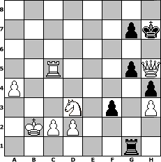 game notation in PGN-format [Event "Schon wieder."] [Site "www.myChess.de"] [Date "2017.10.12"] [Round "2"] [White "Helmut48"] [Black "Achimkogge"] [ECO "D00"] [WhitemyELO "1960"] [BlackmyELO "1340"] [Result "1-0"] [TimeControl "10/2592000"] [WhiteDays "117"] [BlackDays "116"] [MyChessNo "109909"] 1. d4 d5 2. e4 dxe4 3. Nc3 Nf6 4. f3 exf3 5. Qxf3 Qxd4 6. Be3 Qd8 7. Nh3 c6 8. Bd3 Bg4 9. Qg3 e6 10. Nf2 h5 11. h3 Bd6 12. Qh4 Bf5 13. Bxf5 exf5 14. O-O-O Qe7 15. Rhe1 Kf8 16. Bg5 Be5 17. Rxe5 Qxe5 18. Rd8+ Ne8 19. Nd3 Qe6 20. Qb4+ Kg8 21. Qxb7 Kh7 22. Qxa8 Nd7 23. a4 f6 24. Qxa7 fxg5 25. Qxd7 Qxd7 26. Rxd7 Nf6 27. Rc7 Ne4 28. Rxc6 Nxc3 29. Rxc3 f4 30. Rc5 Kh6 31. b4 Re8 32. b5 Re2 33. b6 Rxg2 34. b7 Rg1+ 35. Kb2 f3 36. b8=Q Kh7 37. Qe8 h4 38. Qh5+ 1-0 position notation in FEN-format 8/6pk/8/2R3pQ/P6p/3N1p1P/1KPP4/6r1 - - - 1 38 Captured white pieces: Captured black pieces: Click on a captured piece in order to display the desired move!