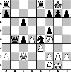 game notation in PGN-format [Event "3. gro"] [Site "www.myChess.de"] [Date "2006.09.17"] [Round "2"] [Board "1"] [White "romain63"] [Black "bane"] [ECO "D02"] [WhitemyELO "1728"] [BlackmyELO "1928"] [Result "0-1"] [TimeControl "10/2592000"] [WhiteDays "30"] [BlackDays "30"] [MyChessNo "28716"] 1. d4 d5 2. Nf3 Nf6 3. Bf4 Bf5 4. e3 e6 5. Bd3 Bd6 6. Bxf5 exf5 7. Ne5 Qe7 8. Nd2 Nbd7 9. Ndf3 Ne4 10. Nd3 Bxf4 11. Nxf4 Qb4+ 12. Nd2 Ndf6 13. Rb1 O-O 14. c3 Qe7 15. O-O c6 16. Qc2 Nxd2 17. Qxd2 Rfe8 18. b3 Ne4 19. Qc2 b5 20. c4 dxc4 21. bxc4 bxc4 22. Rb4 Qxb4 0-1 position notation in FEN-format r3r1k1/p4ppp/2p5/5p2/1qpPnN2/4P3/P1Q2PPP/5RK1 - - - 0 23 Captured white pieces: Captured black pieces: Click on a captured piece in order to display the desired move!