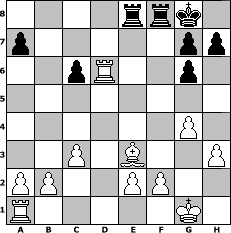 | game notation in PGN-format [Event "5 Jahre Wikinger"] [Site "www.myChess.de"] [Date "2009.12.13"] [Round "1"] [White "muetoe"] [Black "beowulf"] [ECO "C66"] [WhitemyELO "1859"] [BlackmyELO "1340"] [Result "1-0"] [TimeControl "10/864000"] [WhiteDays "09"] [BlackDays "10"] [MyChessNo "61482"] 1. e4 e5 2. Nf3 Nc6 3. Bb5 Nf6 4. O-O d6 5. d3 Be7 6. c3 O-O 7. Re1 Bg4 8. h3 Bh5 9. Bxc6 bxc6 10. Nbd2 d5 11. g4 Bg6 12. Nxe5 dxe4 13. dxe4 Nxe4 14. Nxg6 fxg6 15. Nxe4 Qxd1 16. Rxd1 Rae8 17. Be3 Bd6 18. Nxd6 cxd6 19. Rxd6 1-0 position notation in FEN-format 4rrk1/p5pp/2pR2p1/8/6P1/2P1B2P/PP2PP2/R5K1 - - - 0 19 Captured white pieces:                              Captured black pieces:                               Click on a captured piece in order to display the desired move!