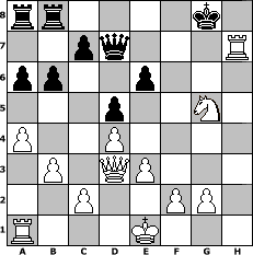 game notation in PGN-format [Event "Kellertunier"] [Site "www.myChess.de"] [Date "2005.08.15"] [Round "1"] [White "crca108"] [Black "tuergeist"] [ECO "D01"] [WhitemyELO "1396"] [BlackmyELO "1264"] [Result "1-0"] [TimeControl "10/864000"] [WhiteDays "10"] [BlackDays "09"] [MyChessNo "16252"] 1. d4 d5 2. Nc3 e6 3. Nf3 Bb4 4. Bd2 Nf6 5. e3 Ne4 6. Nxe4 Bxd2+ 7. Nexd2 Nc6 8. Bb5 Bd7 9. Nb3 O-O 10. h4 a6 11. Bd3 Nb4 12. Ng5 Nxd3+ 13. Qxd3 g6 14. Nc5 Bb5 15. Qb3 f6 16. Nf3 b6 17. Nd3 Qd6 18. a4 Bc4 19. Qc3 Rfb8 20. b3 Bxd3 21. Qxd3 g5 22. hxg5 fxg5 23. Nxg5 Qd7 24. Rxh7 1-0 position notation in FEN-format rr4k1/2pq3R/pp2p3/3p2N1/P2P4/1P1QP3/2P2PP1/R3K3 - Q - 0 24 Captured white pieces: ![]() ![]() ![]() ![]() ![]() ![]() ![]() ![]() ![]() ![]() ![]() ![]() ![]() ![]() ![]() Captured black pieces: ![]() ![]() ![]() ![]() ![]() ![]() ![]() ![]() ![]() ![]() ![]() ![]() ![]() ![]() ![]() Click on a captured piece in order to display the desired move!