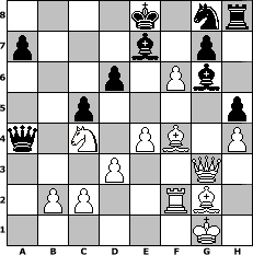 game notation in PGN-format [Event "startup 2006"] [Site "www.myChess.de"] [Date "2006.01.01"] [Round "1"] [White "bane"] [Black "Juri"] [ECO "A30"] [WhitemyELO "1863"] [BlackmyELO "1593"] [Result "1-0"] [TimeControl "10/3456000"] [WhiteDays "40"] [BlackDays "40"] [MyChessNo "21291"] 1. c4 c5 2. e4 e5 3. Nf3 d6 4. d3 Bg4 5. Nbd2 Nc6 6. h3 Bh5 7. g4 Bg6 8. Bg2 Qa5 9. O-O b5 10. Nb3 Qa6 11. Nfd2 Na5 12. cxb5 Qxb5 13. Nxa5 Qxa5 14. Nc4 Qb5 15. h4 h5 16. g5 Rb8 17. a4 Qa6 18. f4 f6 19. Qf3 exf4 20. Bxf4 Be7 21. Rf2 Rb4 22. Qg3 Rxa4 23. Rxa4 Qxa4 24. gxf6 1-0 position notation in FEN-format 4k1nr/p3b1p1/3p1Pb1/2p4p/q1N1PB1P/3P2Q1/1PP2RB1/6K1 - k - 0 24 Captured white pieces: Captured black pieces: Click on a captured piece in order to display the desired move!