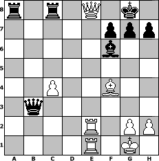 game notation in PGN-format [Event "Zwischendurch mal ein paar eigene Z"] [Site "www.myChess.de"] [Date "2007.11.12"] [Round "1"] [White "Naunhofer"] [Black "Ostseeboy"] [ECO "C57"] [WhitemyELO "1660"] [BlackmyELO "1286"] [Result "1-0"] [TimeControl "10/1728000"] [WhiteDays "78"] [BlackDays "78"] [MyChessNo "39732"] 1. e4 e5 2. Nf3 Nc6 3. Bc4 Nf6 4. Ng5 d5 5. exd5 Nxd5 6. d3 Be7 7. Ne4 O-O 8. O-O a6 9. Nbc3 Nxc3 10. Nxc3 b5 11. Bd5 Bb7 12. Qg4 Na5 13. Bxb7 Nxb7 14. Bh6 Bf6 15. Ne4 Nd6 16. Be3 a5 17. b3 Nxe4 18. Qxe4 Qd7 19. Rad1 Rfe8 20. Rfe1 c6 21. Re2 Qe7 22. Rde1 c5 23. Qc6 c4 24. dxc4 bxc4 25. Qxc4 Rec8 26. Qe4 Qb4 27. c4 a4 28. f4 exf4 29. Bxf4 axb3 30. axb3 Qxb3 31. Qe8+ 1-0 position notation in FEN-format r1r1Q1k1/5ppp/5b2/8/2P2B2/1q6/4R1PP/4R1K1 - - - 1 31 Captured white pieces: Captured black pieces: Click on a captured piece in order to display the desired move!