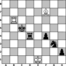 game notation in PGN-format [Event "Weinprobe 2018"] [Site "www.myChess.de"] [Date "2018.10.01"] [Round "1"] [White "beowulf"] [Black "Andylein1989"] [ECO "A10"] [WhitemyELO "1397"] [BlackmyELO "1648"] [Result "0-1"] [TimeControl "10/1728000"] [WhiteDays "20"] [BlackDays "20"] [MyChessNo "113142"] 1. c4 d5 2. d4 e6 3. Nf3 Nf6 4. Bg5 Be7 5. e3 b6 6. Nc3 Bb7 7. cxd5 Nxd5 8. Bxe7 Qxe7 9. Bc4 Qb4 10. Qb3 Qxb3 11. Bxb3 Nxc3 12. bxc3 Bxf3 13. gxf3 Nd7 14. Bc2 c5 15. Rg1 g6 16. Ba4 Ke7 17. Kd2 Rac8 18. Bb5 Nf6 19. a4 Rc7 20. a5 Rd8 21. axb6 axb6 22. Ra6 Rd6 23. Rga1 Nd5 24. e4 Nf4 25. R1a4 cxd4 26. Rxd4 Nh3 27. Rxd6 Kxd6 28. c4 Kc5 29. Ke3 f5 30. Ra2 Rf7 31. Re2 Ng5 32. Rd2 h5 33. e5 f4+ 34. Ke2 Rf5 35. Rd8 Rxe5+ 36. Kd3 Nxf3 37. Rc8+ Kb4 38. Rc6 Nxh2 39. Rxb6 Ka3 40. Be8 Ng4 41. Bxg6 Nxf2+ 42. Kc3 Re3+ 43. Kd2 Ne4+ 44. Kc2 Rc3+ 45. Kd1 Rxc4 46. Rxe6 Ng3 47. Rf6 h4 48. Bf7 Re4 49. Bg6 Rd4+ 50. Ke1 h3 51. Bf7 h2 52. Ra6+ Kb4 53. Rb6+ Kc5 0-1 position notation in FEN-format 8/5B2/1R6/2k5/3r1p2/6n1/7p/4K3 - - - 4 54 Captured white pieces: Captured black pieces: Click on a captured piece in order to display the desired move!