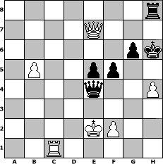 game notation in PGN-format [Event "Mittelklasse-Turnier"] [Site "www.myChess.de"] [Date "2007.10.20"] [Round "1"] [White "tecker2010"] [Black "reisinger"] [ECO "B20"] [WhitemyELO "1504"] [BlackmyELO "1577"] [Result "1/2-1/2"] [TimeControl "10/864000"] [WhiteDays "10"] [BlackDays "10"] [MyChessNo "39101"] 1. e4 c5 2. Bc4 Nf6 3. Nc3 a6 4. e5 d5 5. exd6 Qxd6 6. Qf3 Nc6 7. Nd5 Nxd5 8. Bxd5 Ne5 9. Qb3 e6 10. Bxb7 Rb8 11. Qa4+ Nd7 12. Bxc8 Rxc8 13. d3 Be7 14. Nf3 O-O 15. O-O Ne5 16. Nxe5 Qxe5 17. Qxa6 Rcd8 18. Qc4 Rd4 19. Qc3 Bd6 20. g3 h5 21. Be3 Qd5 22. Bxd4 cxd4 23. Qd2 Qf3 24. Rae1 h4 25. Qe2 Qd5 26. Qe4 Qxa2 27. Qxd4 Qa6 28. Qxh4 Rc8 29. c4 Qa7 30. Ra1 Qb7 31. Qd4 Bc5 32. Qc3 Rd8 33. Rfd1 Bd4 34. Qa5 Rc8 35. Ra2 g6 36. Rb1 Qf3 37. Qd2 Kg7 38. b4 Rh8 39. Qe2 Qf5 40. Qe4 Qf6 41. b5 e5 42. Rc1 Qg5 43. Rac2 f5 44. h4 Qxg3+ 45. Qg2 Qxd3 46. Qb7+ Kh6 47. Qe7 Qg3+ 48. Kf1 Qd3+ 49. Re2 Qh3+ 50. Ke1 Bc3+ 51. Rd2 Qh1+ 52. Ke2 Qe4+ 53. Kd1 Bxd2 54. Kxd2 Qf4+ 55. Kc2 Qxc4+ 56. Kd1 Qd4+ 57. Ke2 Qe4+ 1/2-1/2 position notation in FEN-format 7r/4Q3/6pk/1P2pp2/4q2P/8/4KP2/2R5 - - - 4 58 Captured white pieces: Captured black pieces: Click on a captured piece in order to display the desired move!
