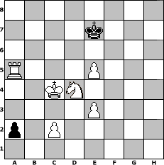 game notation in PGN-format [Event "August 18"] [Site "www.myChess.de"] [Date "2018.08.01"] [Round "1"] [White "S04boy"] [Black "borsti"] [ECO "D02"] [WhitemyELO "1191"] [BlackmyELO "1287"] [Result "1-0"] [TimeControl "10/1728000"] [WhiteDays "20"] [BlackDays "20"] [MyChessNo "112747"] 1. d4 d5 2. Nf3 Bg4 3. Ne5 Bh5 4. g4 Bg6 5. Nxg6 hxg6 6. Bf4 Nf6 7. e3 Nc6 8. Be5 Nxe5 9. dxe5 Ne4 10. Bd3 f5 11. f3 Ng5 12. h4 Ne6 13. gxf5 gxf5 14. Bxf5 Nc5 15. Nc3 e6 16. Bh3 Qxh4+ 17. Kd2 Qf2+ 18. Qe2 Qxe2+ 19. Kxe2 g5 20. Nb5 O-O-O 21. Bxe6+ Nxe6 22. Rxh8 a6 23. Nc3 Rd7 24. Rah1 c6 25. Na4 Rf7 26. R1h7 Rxh7 27. Rxh7 b5 28. Nc3 a5 29. Rf7 Bg7 30. Rf5 Kd7 31. Kd3 Ke7 32. Ne2 Nc5+ 33. Kd4 Ne6+ 34. Kd3 Nc5+ 35. Kd2 Ne4+ 36. fxe4 Ke6 37. Nd4+ Ke7 38. Nxc6+ Ke6 39. Nxa5 Bxe5 40. Rxg5 Bxb2 41. Rxd5 b4 42. Rb5 Bc3+ 43. Kd3 Kd6 44. a3 bxa3 45. Kxc3 a2 46. Nb3 Kc6 47. Kc4 Kd6 48. e5+ Ke6 49. Nd4+ Ke7 50. Ra5 1-0 position notation in FEN-format 8/4k3/8/R3P3/2KN4/4P3/p1P5/8 - - - 4 50 Captured white pieces: Captured black pieces: Click on a captured piece in order to display the desired move!