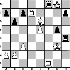 game notation in PGN-format [Event "F"] [Site "www.myChess.de"] [Date "2006.05.06"] [Round "2"] [White "WalterKelsch7"] [Black "FreshPrinc2"] [ECO "A40"] [WhitemyELO "1572"] [BlackmyELO "1670"] [Result "1-0"] [TimeControl "10/1728000"] [WhiteDays "20"] [BlackDays "20"] [MyChessNo "25221"] 1. d4 g6 2. e4 Bh6 3. Bxh6 Nxh6 4. h3 O-O 5. Nf3 f5 6. Bc4+ Nf7 7. Ng5 e6 8. Nxf7 Rxf7 9. e5 Nc6 10. O-O Qh4 11. c3 Nxe5 12. g3 Qxh3 13. dxe5 f4 14. Qf3 fxg3 15. Qxg3 Rf3 16. Qxh3 Rxh3 17. Nd2 b6 18. Ne4 Bb7 19. f3 Bxe4 20. fxe4 Rh4 21. Rad1 Rxe4 22. Bb3 Rg4+ 23. Kh2 Rh4+ 24. Kg3 g5 25. Rxd7 Rf8 26. Bxe6+ 1-0 position notation in FEN-format 5rk1/p1pR3p/1p2B3/4P1p1/7r/2P3K1/PP6/5R2 - - - 0 26 Captured white pieces: Captured black pieces: Click on a captured piece in order to display the desired move!