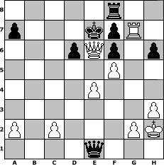 game notation in PGN-format [Event "Jahreswechsel"] [Site "www.myChess.de"] [Date "2009.12.30"] [Round "2"] [White "Andreas"] [Black "MStr"] [ECO "C41"] [WhitemyELO "1506"] [BlackmyELO "1512"] [Result "1-0"] [TimeControl "10/1728000"] [WhiteDays "75"] [BlackDays "28"] [MyChessNo "61945"] 1. e4 e5 2. Nf3 d6 3. d4 exd4 4. Nxd4 Nf6 5. Nc3 Bd7 6. Bg5 Be7 7. Bd3 h6 8. Bxf6 Bxf6 9. Nde2 O-O 10. O-O Nc6 11. Kh1 Bg4 12. h3 Bh5 13. Nd5 Bxb2 14. Rb1 Bxe2 15. Bxe2 Be5 16. Rxb7 Nd4 17. Rxc7 Re8 18. f4 Nxe2 19. Qxe2 Bf6 20. Qc4 Rc8 21. Rxc8 Qxc8 22. Nxf6+ gxf6 23. Qd3 Qc7 24. Rf3 Kg7 25. Rg3+ Kf8 26. f5 Ke7 27. Rg7 Qa5 28. Qc4 Qe1+ 29. Kh2 Rf8 30. Qe6+ 1-0 position notation in FEN-format 5r2/p3kpR1/3pQp1p/5P2/4P3/7P/P1P3PK/4q3 - - - 8 30 Captured white pieces: Captured black pieces: Click on a captured piece in order to display the desired move!