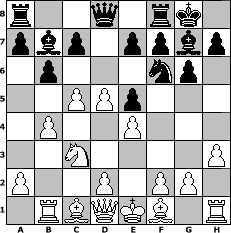 game notation in PGN-format [Event "Summer Games 2021"] [Site "www.myChess.de"] [Date "2021.08.01"] [Round "1"] [White "miu"] [Black "martinus"] [ECO "A53"] [WhitemyELO "1507"] [BlackmyELO "1479"] [Result "1-0"] [TimeControl "10/86400"] [WhiteDays "01"] [BlackDays "00"] [MyChessNo "122650"] 1. d4 Nf6 2. c4 d6 3. Nf3 g6 4. Nc3 Bg7 5. e4 O-O 6. h3 b6 7. b4 Nc6 8. Rb1 Bb7 9. d5 Ne5 10. Nxe5 dxe5 11. c5 1-0 position notation in FEN-format r2q1rk1/pbp1ppbp/1p3np1/2PPp3/1P2P3/2N4P/P2P1PP1/1RBQKB1R - K - 0 11 Captured white pieces: Captured black pieces: Click on a captured piece in order to display the desired move!