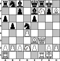 game notation in PGN-format [Event "Alapin-Diemer-Gambit Thematurnier"] [Site "www.myChess.de"] [Date "2010.01.23"] [Round "1"] [White "Kloetzchenschieber"] [Black "Seneca"] [ECO "C01"] [WhitemyELO "1758"] [BlackmyELO "1534"] [Result "1-0"] [TimeControl "10/2592000"] [WhiteDays "30"] [BlackDays "47"] [MyChessNo "62593"] 1. e4 e6 2. d4 d5 3. Be3 dxe4 4. Nd2 Nf6 5. f3 exf3 6. Ngxf3 Be7 7. Bd3 O-O 8. O-O a6 9. Ne5 b5 10. Qf3 Nd5 11. Nxf7 Qe8 12. Bxh7+ 1-0 position notation in FEN-format rnb1qrk1/2p1bNpB/p3p3/1p1n4/3P4/4BQ2/PPPNP1PP/R4RK1 - - - 0 12 Captured white pieces: Captured black pieces: Click on a captured piece in order to display the desired move!