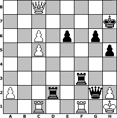 game notation in PGN-format [Event "2er Mannschaftsturnier"] [Site "www.myChess.de"] [Date "2006.11.10"] [Round "1"] [Board "1"] [White "MichaelKnopf"] [Black "zoli"] [ECO "A00"] [WhitemyELO "1559"] [BlackmyELO "1647"] [Result "0-1"] [TimeControl "10/1728000"] [WhiteDays "77"] [BlackDays "42"] [MyChessNo "29889"] 1. g3 b6 2. Bg2 Nc6 3. b4 a5 4. b5 Bb7 5. bxc6 Bxc6 6. Bxc6 dxc6 7. Nf3 Nf6 8. O-O g6 9. c3 e6 10. Bb2 Bg7 11. c4 O-O 12. d4 Qe7 13. Ba3 c5 14. dxc5 Nd7 15. c6 Nc5 16. Nbd2 f5 17. Rb1 a4 18. e4 fxe4 19. Nxe4 Qe8 20. Nxc5 bxc5 21. Bxc5 Rf5 22. Bd4 Rd8 23. g4 Rf4 24. Qxa4 Bxd4 25. Nxd4 Rxg4+ 26. Kh1 Rdxd4 27. Rbc1 Qf8 28. f3 Rgf4 29. Qb3 h5 30. c5 Qf7 31. Kg2 Qf6 32. Qb8+ Rd8 33. Qxc7 Rd2+ 34. Kh1 Rxf3 35. Qc8+ Kh7 36. Kg1 Qg5+ 37. Kh1 Qg2# 0-1 position notation in FEN-format 2Q5/7k/2P1p1p1/2P4p/8/5r2/P2r2qP/2R2R1K - - - 6 38 Captured white pieces: Captured black pieces: Click on a captured piece in order to display the desired move!