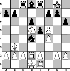 game notation in PGN-format [Event "Der T"] [Site "www.myChess.de"] [Date "2010.05.02"] [Round "1"] [White "jeremyt"] [Black "nyffhans"] [ECO "B23"] [WhitemyELO "1907"] [BlackmyELO "1788"] [Result "1-0"] [TimeControl "10/2592000"] [WhiteDays "30"] [BlackDays "00"] [MyChessNo "65226"] 1. e4 c5 2. Nc3 Nc6 3. Nf3 d6 4. d4 cxd4 5. Nxd4 Nf6 6. Bg5 e6 7. Qd2 Be7 8. O-O-O O-O 9. f4 h6 10. Bh4 e5 11. Nf5 Bxf5 12. exf5 Qa5 13. Bc4 Qb4 14. Bb3 Nd4 15. Bxf6 Bxf6 16. Nd5 Qxd2+ 17. Rxd2 Bd8 18. Rf1 Rc8 19. Kd1 Re8 20. Re1 1-0 position notation in FEN-format 2rbr1k1/pp3pp1/3p3p/3NpP2/3n1P2/1B6/PPPRP1PP/3KR3 - - - 6 20 Captured white pieces: Captured black pieces: Click on a captured piece in order to display the desired move!