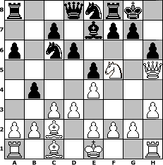 game notation in PGN-format [Event "Sommerevent"] [Site "www.myChess.de"] [Date "2018.07.12"] [Round "1"] [White "Andylein1989"] [Black "Steffi"] [ECO "C65"] [WhitemyELO "1679"] [BlackmyELO "1570"] [Result "1-0"] [TimeControl "10/1728000"] [WhiteDays "19"] [BlackDays "01"] [MyChessNo "112616"] 1. e4 e5 2. Nf3 Nc6 3. Bb5 Nf6 4. d3 d6 5. c3 Be7 6. Nbd2 O-O 7. Nf1 h6 8. Ng3 Bg4 9. h3 Bxf3 10. Qxf3 a6 11. Ba4 b5 12. Bc2 b4 13. Nf5 Ne8 14. Qh5 1-0 position notation in FEN-format r2qnrk1/2p1bpp1/p1np3p/4pN1Q/1p2P3/2PP3P/PPB1PPP1/R1B1K2R - KQ - 3 14 Captured white pieces: Captured black pieces: Click on a captured piece in order to display the desired move!