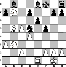 game notation in PGN-format [Event "960-2018-56-Geburtstagsturnier"] [Site "www.myChess.de"] [Date "2018.02.18"] [Round "1"] [White "Cuibono"] [Black "Peterlie77 (C)"] [Variant "Fischerrandom"] [SetUp "1"] [FEN "nbnrbqkr/pppppppp/8/8/8/8/PPPPPPPP/NBNRBQKR w KQkq - 0 1"] [WhitemyELO "2245"] [BlackmyELO "2124"] [Result "1/2-1/2"] [TimeControl "10/2592000"] [WhiteDays "30"] [BlackDays "28"] [MyChessNo "111476"] 1. c4 c5 2. Nab3 Ncb6 3. Na5 Na4 4. Nxb7 Nxb2 5. Nxd8 Nxd1 6. e3 Nb2 7. d4 e6 8. Nb7 cxd4 9. Qe2 Qa3 10. exd4 Nb6 11. c5 Nd5 12. O-O Na4 13. Qc4 Nac3 14. Bxc3 Qxc3 15. Bd3 Qb4 16. Qxb4 Nxb4 17. Bb5 Kf8 18. a3 Nd5 19. Nb3 f5 20. Re1 1/2-1/2 position notation in FEN-format 1b2bk1r/pN1p2pp/4p3/1BPn1p2/3P4/PN6/2P2PPP/4R1K1 - - - 1 20 Captured white pieces: Captured black pieces: Click on a captured piece in order to display the desired move!