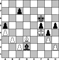 game notation in PGN-format [Event "Wrixum - Open die I."] [Site "www.myChess.de"] [Date "2004.12.11"] [Round "1"] [White "Wormatia08"] [Black "bjeu"] [ECO "C41"] [WhitemyELO "1474"] [BlackmyELO "1510"] [Result "0-1"] [TimeControl "10/2592000"] [WhiteDays "30"] [BlackDays "30"] [MyChessNo "8714"] 1. e4 e5 2. Nf3 d6 3. d4 exd4 4. Nxd4 Nf6 5. Nc3 Bd7 6. Bc4 Nc6 7. O-O Ne5 8. Bb3 a6 9. f4 Nc6 10. e5 dxe5 11. fxe5 Nxe5 12. Re1 Bd6 13. Bf4 Qe7 14. Nf3 Nxf3+ 15. Qxf3 Be6 16. Qxb7 O-O 17. Bxe6 Bxf4 18. Nd5 Nxd5 19. Bxd5 Qc5+ 20. Kh1 Rfb8 21. Qc6 Qxc6 22. Bxc6 Ra7 23. b3 a5 24. g3 Bd6 25. Re2 Ra6 26. Bd5 Kf8 27. Rae1 Bb4 28. Rf1 f6 29. Rf4 Rd8 30. Bc4 Rad6 31. Rfe4 Rd2 32. Rxd2 Rxd2 33. Bd3 g6 34. a4 f5 35. Re2 Rxe2 36. Bxe2 h5 37. Kg2 Ke7 38. Kf3 g5 39. Ke3 g4 40. Kf4 Kf6 41. Bd3 Bd2# 0-1 position notation in FEN-format 8/2p5/5k2/p4p1p/P4Kp1/1P1B2P1/2Pb3P/8 - - - 4 42 Captured white pieces: Captured black pieces: Click on a captured piece in order to display the desired move!