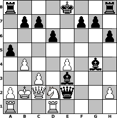 game notation in PGN-format [Event "Wanderpokal November 2006"] [Site "www.myChess.de"] [Date "2006.11.11"] [Round "1"] [White "Fussel"] [Black "Knight"] [ECO "C43"] [WhitemyELO "1300"] [BlackmyELO "1345"] [Result "0-1"] [TimeControl "10/864000"] [WhiteDays "00"] [BlackDays "10"] [MyChessNo "29964"] 1. e4 e5 2. Nf3 Nf6 3. d4 exd4 4. Nxd4 Bc5 5. Bg5 h6 6. Bxf6 Qxf6 7. c3 Nc6 8. Nd2 Nxd4 9. b4 Nc2+ 10. Qxc2 Qxf2+ 11. Kd1 Be3 12. Be2 Qxg2 13. Rf1 d6 14. Kc1 Qxe2 15. Rd1 Bg4 16. Kb2 a5 0-1 position notation in FEN-format r3k2r/1pp2pp1/3p3p/p7/1P2P1b1/2P1b3/PKQNq2P/R2R4 - kq - 0 17 Captured white pieces: Captured black pieces: Click on a captured piece in order to display the desired move!