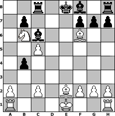 game notation in PGN-format [Event "mySchach.de - 1. Turnier 2003"] [Site "www.myChess.de"] [Date "2003.07.25"] [Round "1"] [White "larlinde"] [Black "Chaos"] [ECO "B41"] [WhitemyELO "1706"] [BlackmyELO "1613"] [Result "1-0"] [TimeControl "10/2592000"] [WhiteDays "59"] [BlackDays "60"] [MyChessNo "385"] 1. e4 c5 2. Nf3 e6 3. d4 d5 4. exd5 exd5 5. Bb5+ Bd7 6. Qe2+ Qe7 7. Be3 Nc6 8. Nc3 Nf6 9. dxc5 d4 10. Nxd4 Nxd4 11. Bxd4 Qxe2+ 12. Bxe2 Rc8 13. b4 a5 14. Bxf6 axb4 15. Nd5 Bc6 16. Nb6 1-0 position notation in FEN-format 2r1kb1r/1p3ppp/1Nb2B2/2P5/1p6/8/P1P1BPPP/R3K2R - KQk - 3 16 Captured white pieces: ![]() ![]() ![]() ![]() ![]() ![]() ![]() ![]() ![]() ![]() ![]() ![]() ![]() ![]() ![]() Captured black pieces: ![]() ![]() ![]() ![]() ![]() ![]() ![]() ![]() ![]() ![]() ![]() ![]() ![]() ![]() ![]() Click on a captured piece in order to display the desired move!