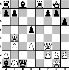 | game notation in PGN-format [Event "Schach f"] [Site "www.myChess.de"] [Date "2008.11.01"] [Round "1"] [Board "4"] [White "Hobbykegler"] [Black "Naunhofer"] [ECO "B20"] [WhitemyELO "1123"] [BlackmyELO "1594"] [Result "0-1"] [TimeControl "10/2592000"] [WhiteDays "28"] [BlackDays "30"] [MyChessNo "49332"] 1. e4 c5 2. Bc4 e6 3. Nf3 d5 4. exd5 exd5 5. Bd3 c4 6. Qe2+ Be7 7. O-O cxd3 8. Qxd3 Nf6 9. Re1 Nc6 10. b3 O-O 11. Ng5 h6 12. Nf3 Nb4 13. Qc3 Ne4 14. Qd4 Nxc2 15. Qe5 Bf6 16. Qf4 Nxe1 17. Nxe1 Bxa1 18. d3 Ng5 19. Nf3 Re8 20. Bd2 Nxf3+ 21. Qxf3 Qg5 22. Bb4 Qc1+ 0-1 position notation in FEN-format r1b1r1k1/pp3pp1/7p/3p4/1B6/1P1P1Q2/P4PPP/bNq3K1 - - - 3 23 Captured white pieces:                              Captured black pieces:                               Click on a captured piece in order to display the desired move!