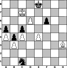 game notation in PGN-format [Event "Herbstturnier 2"] [Site "www.myChess.de"] [Date "2011.10.05"] [Round "1"] [White "Achimkogge"] [Black "augustus"] [ECO "C21"] [WhitemyELO "1381"] [BlackmyELO "1258"] [Result "1-0"] [TimeControl "10/1728000"] [WhiteDays "20"] [BlackDays "20"] [MyChessNo "76595"] 1. e4 e5 2. d4 Nf6 3. f3 Bb4+ 4. c3 Bd6 5. Bg5 c5 6. d5 a6 7. Bd3 b5 8. c4 Be7 9. Nh3 d6 10. a3 Bd7 11. O-O Bxh3 12. gxh3 Nbd7 13. Nc3 Nh5 14. Bxe7 Qxe7 15. Qe1 Nf4 16. Bc2 Qg5+ 17. Qg3 Qxg3+ 18. hxg3 Nxh3+ 19. Kg2 Ng5 20. Rh1 f6 21. g4 g6 22. b3 h5 23. gxh5 gxh5 24. Kg3 Ke7 25. Rh4 Rag8 26. Kf2 Nf8 27. Rg1 Ng6 28. Rh2 Nf4 29. Ke3 h4 30. Ne2 Nxe2 31. Kxe2 h3 32. Rg4 Rb8 33. Bd3 b4 34. a4 a5 35. Ke3 Rbg8 36. Bf1 Rh5 37. f4 exf4+ 38. Kxf4 Kf7 39. Bd3 Nh7 40. Rxg8 Kxg8 41. Kg4 Rh6 42. Kf5 Nf8 43. Be2 Ng6 44. Bg4 Ne5 45. Rxh3 Rxh3 46. Bxh3 Kg7 47. Ke6 Kf8 48. Kxd6 Nd3 49. Kc6 Nc1 50. d6 Ke8 51. Kc7 1-0 position notation in FEN-format 4k3/2K5/3P1p2/p1p5/PpP1P3/1P5B/8/2n5 - - - 2 51 Captured white pieces: Captured black pieces: Click on a captured piece in order to display the desired move!