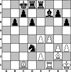 game notation in PGN-format [Event "Mini-Masters 2"] [Site "www.myChess.de"] [Date "2004.10.19"] [Round "2"] [White "UPS"] [Black "torsten64"] [ECO "C45"] [WhitemyELO "1479"] [BlackmyELO "1842"] [Result "0-1"] [TimeControl "10/864000"] [WhiteDays "06"] [BlackDays "10"] [MyChessNo "7490"] 1. e4 e5 2. Nf3 Nc6 3. d4 exd4 4. Nxd4 Bc5 5. c3 Qh4 6. Qd3 Nf6 7. Nd2 Ng4 8. g3 Qf6 9. f3 Nge5 10. Qe3 d6 11. Bg2 Be6 12. O-O Nc4 13. Qd3 Nxd4 14. cxd4 Qxd4+ 15. Qxd4 Bxd4+ 16. Kh1 Nxb2 17. Rb1 Nd3 18. h3 Bxa2 19. Rxb7 Bb6 20. f4 O-O-O 21. Rxb6 axb6 22. Nf3 Rhe8 23. Ng5 h6 24. Nxf7 Bxf7 0-1 position notation in FEN-format 2krr3/2p2bp1/1p1p3p/8/4PP2/3n2PP/4P1B1/2B2R1K - - - 0 25 Captured white pieces: ![]() ![]() ![]() ![]() ![]() ![]() ![]() ![]() ![]() ![]() ![]() ![]() ![]() ![]() ![]() Captured black pieces: ![]() ![]() ![]() ![]() ![]() ![]() ![]() ![]() ![]() ![]() ![]() ![]() ![]() ![]() ![]() Click on a captured piece in order to display the desired move!