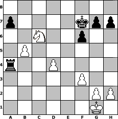 game notation in PGN-format [Event "Rechnerfrei B"] [Site "www.myChess.de"] [Date "2010.02.07"] [Round "1"] [White "nogumo"] [Black "73DADDELDU37"] [ECO "A00"] [WhitemyELO "1611"] [BlackmyELO "1470"] [Result "1/2-1/2"] [TimeControl "10/1728000"] [WhiteDays "59"] [BlackDays "80"] [MyChessNo "62995"] 1. b4 e6 2. Bb2 Nf6 3. b5 Be7 4. e3 b6 5. Nf3 Bb7 6. c4 d5 7. Nc3 O-O 8. a4 Nbd7 9. cxd5 exd5 10. d4 Bb4 11. Qb3 Qe7 12. Bd3 c5 13. dxc5 Nxc5 14. Qc2 Rac8 15. O-O Bxc3 16. Bxc3 Nxd3 17. Qxd3 Ne4 18. Bb2 Rfd8 19. Rac1 Qb4 20. Qd4 Qxd4 21. Bxd4 Rc4 22. Rxc4 dxc4 23. Rc1 Bd5 24. Ne5 Nd2 25. f3 Nb3 26. Rc3 f6 27. Nxc4 Nxd4 28. exd4 Rc8 29. Nxb6 Rxc3 30. Nxd5 Rc4 31. Ne7+ Kf7 32. Nc6 Rxa4 1/2-1/2 position notation in FEN-format 8/p4kpp/2N2p2/1P6/r2P4/5P2/6PP/6K1 - - - 0 33 Captured white pieces: ![]() ![]() ![]() ![]() ![]() ![]() ![]() ![]() ![]() ![]() ![]() ![]() ![]() ![]() ![]() Captured black pieces: ![]() ![]() ![]() ![]() ![]() ![]() ![]() ![]() ![]() ![]() ![]() ![]() ![]() ![]() ![]() Click on a captured piece in order to display the desired move!