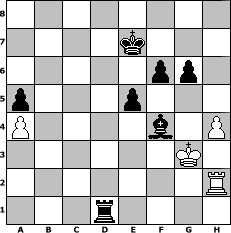 game notation in PGN-format [Event "!!!Turnier in den Sommer!!!"] [Site "www.myChess.de"] [Date "2011.03.02"] [Round "1"] [White "Lemmi11"] [Black "espero"] [ECO "A56"] [WhitemyELO "1775"] [BlackmyELO "1652"] [Result "0-1"] [TimeControl "10/1728000"] [WhiteDays "97"] [BlackDays "77"] [MyChessNo "72508"] 1. d4 Nf6 2. c4 c5 3. Nf3 cxd4 4. Qxd4 Nc6 5. Qd3 g6 6. h3 Bg7 7. Nc3 O-O 8. Be3 d6 9. g4 Be6 10. Rc1 d5 11. g5 Ne4 12. Nxd5 Qa5+ 13. Nd2 Bf5 14. Qb3 Rfd8 15. f3 Nd6 16. Bf4 Nd4 17. Qb4 Qxb4 18. Nxb4 e5 19. Bg3 Rac8 20. e3 Nc6 21. Nd5 Be6 22. e4 Nd4 23. Ne7+ Kf8 24. Nxc8 Rxc8 25. Kf2 b5 26. b3 h6 27. h4 a5 28. gxh6 Bxh6 29. Rd1 f6 30. Bh3 Bxh3 31. Rxh3 bxc4 32. Nxc4 Nxc4 33. bxc4 Rxc4 34. a3 Rc2+ 35. Ke1 Nxf3+ 36. Kf1 Nd2+ 37. Ke1 Nxe4 38. Rh2 Rc3 39. a4 Rxg3 40. Rd8+ Ke7 41. Rd1 Rg1+ 42. Ke2 Ng3+ 43. Kf2 Rxd1 44. Kxg3 Bf4+ 0-1 position notation in FEN-format 8/4k3/5pp1/p3p3/P4b1P/6K1/7R/3r4 - - - 1 45 Captured white pieces: ![]() ![]() ![]() ![]() ![]() ![]() ![]() ![]() ![]() ![]() ![]() ![]() ![]() ![]() ![]() Captured black pieces: ![]() ![]() ![]() ![]() ![]() ![]() ![]() ![]() ![]() ![]() ![]() ![]() ![]() ![]() ![]() Click on a captured piece in order to display the desired move!