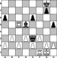 game notation in PGN-format [Event "Nach dem Weltuntergang 2012"] [Site "www.myChess.de"] [Date "2012.12.27"] [Round "1"] [White "sprinterde"] [Black "Stecher1966"] [ECO "B40"] [WhitemyELO "1675"] [BlackmyELO "1501"] [Result "0-1"] [TimeControl "10/864000"] [WhiteDays "10"] [BlackDays "07"] [MyChessNo "85701"] 1. e4 c5 2. Nf3 e6 3. Nc3 Nc6 4. Bb5 a6 5. Bxc6 bxc6 6. d3 d5 7. Bf4 Bd6 8. e5 Be7 9. O-O f6 10. exf6 Nxf6 11. Ne5 Bb7 12. Bg5 O-O 13. Qe1 Nd7 14. Nxd7 Qxd7 15. Bxe7 Qxe7 16. Na4 Rf5 17. Qa5 d4 18. Qb6 Raf8 19. Rae1 h6 20. f3 h5 21. Re4 c4 22. Rxd4 Rb5 23. Qa7 Ra8 24. Qxa8+ Bxa8 25. Rxc4 c5 26. b3 Bd5 27. Rc3 Qg5 28. Nxc5 Rxc5 29. Rxc5 Qe3+ 0-1 position notation in FEN-format 6k1/6p1/p3p3/2Rb3p/8/1P1PqP2/P1P1P1PP/5RK1 - - - 1 30 Captured white pieces: Captured black pieces: Click on a captured piece in order to display the desired move!