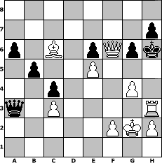 game notation in PGN-format [Event "Weihnachtsturnier 2012"] [Site "www.myChess.de"] [Date "2012.12.18"] [Round "1"] [White "Wulfen49"] [Black "reisender"] [ECO "B00"] [WhitemyELO "1263"] [BlackmyELO "1409"] [Result "1-0"] [TimeControl "10/864000"] [WhiteDays "10"] [BlackDays "07"] [MyChessNo "85582"] 1. e4 b6 2. Nf3 Bb7 3. Nc3 g6 4. d4 Bg7 5. Bc4 e6 6. O-O Nf6 7. Bg5 Qc8 8. d5 O-O 9. dxe6 dxe6 10. e5 Ne4 11. Nxe4 Bxe4 12. Re1 Qb7 13. Be2 Nd7 14. Qxd7 Bc6 15. Qd2 Rab8 16. Bf6 Bxf3 17. Bxf3 c6 18. Bxg7 Kxg7 19. Qf4 Rbc8 20. Qf6+ Kg8 21. Qh4 Rfe8 22. Rad1 Qa6 23. a3 b5 24. Qb4 c5 25. Qe4 c4 26. Qb7 Qa5 27. Bc6 Red8 28. Rxd8+ Rxd8 29. c3 Qa4 30. g3 a6 31. Re3 Qb3 32. Rf3 Qxb2 33. Qxf7+ Kh8 34. Qf6+ Kg8 35. Qxd8+ Kg7 36. Qf6+ Kh6 37. g4 Qc1+ 38. Kg2 Qxa3 39. Rh3# 1-0 position notation in FEN-format 8/7p/p1B1pQpk/1p2P3/2p3P1/q1P4R/5PKP/8 - - - 1 39 Captured white pieces: Captured black pieces: Click on a captured piece in order to display the desired move!