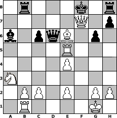 game notation in PGN-format [Event "Blitz-Masters Gruppe A"] [Site "www.myChess.de"] [Date "2005.10.08"] [Round "1"] [White "crca108"] [Black "FreshPrinc2"] [ECO "C24"] [WhitemyELO "1325"] [BlackmyELO "885"] [Result "1-0"] [TimeControl "10/86400"] [WhiteDays "01"] [BlackDays "01"] [MyChessNo "18345"] 1. e4 e5 2. Bc4 Nf6 3. d3 Nc6 4. Be3 a6 5. Nf3 b5 6. Bb3 a5 7. a3 d5 8. O-O dxe4 9. dxe4 a4 10. Nxe5 Nxe5 11. f4 Ba6 12. fxe5 b4 13. Bxa4+ Nd7 14. Rf3 bxa3 15. Nxa3 Rb8 16. Rb1 c6 17. Bb3 Nxe5 18. Rf5 Bd6 19. Bd4 g6 20. Bxe5 Bxe5 21. Rxe5+ Kf8 22. Qf3 Qd7 23. Be6 Qd6 24. Qxf7# 1-0 position notation in FEN-format 1r3k1r/5Q1p/b1pqB1p1/4R3/4P3/N7/1PP1P1PP/1R4K1 - - - 0 24 Captured white pieces: ![]() ![]() ![]() ![]() ![]() ![]() ![]() ![]() ![]() ![]() ![]() ![]() ![]() ![]() ![]() Captured black pieces: ![]() ![]() ![]() ![]() ![]() ![]() ![]() ![]() ![]() ![]() ![]() ![]() ![]() ![]() ![]() Click on a captured piece in order to display the desired move!