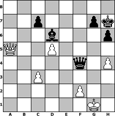 game notation in PGN-format [Event ""Gehirn Jogging A""] [Site "www.myChess.de"] [Date "2010.04.28"] [Round "2"] [White "Pinguin"] [Black "reisender"] [ECO "C42"] [WhitemyELO "1557"] [BlackmyELO "1406"] [Result "0-1"] [TimeControl "10/1728000"] [WhiteDays "20"] [BlackDays "16"] [MyChessNo "65120"] 1. e4 e5 2. Nf3 Nf6 3. Nxe5 d6 4. Nf3 Be7 5. Nc3 Nc6 6. Bb5 Bd7 7. Bxc6 Bxc6 8. d3 O-O 9. Be3 Ng4 10. Qe2 Nxe3 11. Qxe3 d5 12. exd5 Bxd5 13. Nxd5 Qxd5 14. O-O Bc5 15. Qe5 Qc6 16. c3 Rfe8 17. Qg5 h6 18. Qd2 Re6 19. Rfe1 Rae8 20. Rxe6 Rxe6 21. Re1 Rg6 22. Kf1 b5 23. d4 Bd6 24. h3 Qc4+ 25. Qe2 Qxa2 26. Nh4 Re6 27. Qxb5 Rxe1+ 28. Kxe1 Qb1+ 29. Ke2 Qe4+ 30. Kf1 Qxh4 31. Qb8+ Kh7 32. Qxa7 Qf4 33. g3 Qc1+ 34. Kg2 Qxb2 35. Qa5 Qc2 36. h4 f5 37. d5 Qe4+ 38. Kg1 f4 39. gxf4 Qxf4 0-1 position notation in FEN-format 8/2p3pk/3b3p/Q2P4/5q1P/2P5/5P2/6K1 - - - 0 40 Captured white pieces: Captured black pieces: Click on a captured piece in order to display the desired move!