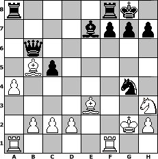 game notation in PGN-format [Event "Dabei ist alles 9"] [Site "www.myChess.de"] [Date "2010.03.22"] [Round "1"] [White "Knight"] [Black "neve"] [ECO "A45"] [WhitemyELO "1135"] [BlackmyELO "1385"] [Result "0-1"] [TimeControl "10/864000"] [WhiteDays "10"] [BlackDays "10"] [MyChessNo "64207"] 1. d4 Nf6 2. Nc3 d5 3. f3 b6 4. e4 dxe4 5. Be3 Bb7 6. Bb5+ Nbd7 7. Nh3 exf3 8. gxf3 c6 9. Ba4 e5 10. dxe5 Nxe5 11. O-O Be7 12. Qe2 O-O 13. Kh1 c5 14. Kg1 a6 15. Qg2 b5 16. Nxb5 axb5 17. Bxb5 Qb6 18. a4 Neg4 19. fxg4 Bxg2 20. Kxg2 Nxg4 0-1 position notation in FEN-format r4rk1/4bppp/1q6/1Bp5/P5n1/4B2N/1PPP2KP/R4R2 - - - 0 21 Captured white pieces: Captured black pieces: Click on a captured piece in order to display the desired move!