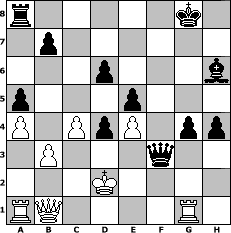 game notation in PGN-format [Event "Urlaubsendspiel"] [Site "www.myChess.de"] [Date "2011.08.30"] [Round "1"] [White "Zwilling"] [Black "martinus"] [ECO "B20"] [WhitemyELO "1484"] [BlackmyELO "1732"] [Result "0-1"] [TimeControl "10/1728000"] [WhiteDays "20"] [BlackDays "20"] [MyChessNo "75818"] 1. e4 c5 2. c4 Nc6 3. Nf3 d6 4. Nc3 Bg4 5. Be2 Nf6 6. h3 Bxf3 7. Bxf3 g6 8. O-O Bg7 9. d3 O-O 10. Be3 Nd4 11. Bxd4 cxd4 12. Ne2 e5 13. a3 Qc7 14. Qb3 a5 15. a4 Nd7 16. Qc2 Nc5 17. b3 f5 18. Ng3 f4 19. Ne2 Ne6 20. Nc1 Ng5 21. Qe2 Qe7 22. Kh2 Nxf3+ 23. Qxf3 g5 24. g4 fxg3+ 25. Qxg3 Rf4 26. f3 h5 27. Ne2 Rh4 28. Rg1 g4 29. Qf2 Rxh3+ 30. Kg2 Rxf3 31. Qe1 h4 32. Kh1 Rh3+ 33. Kg2 Rxd3 34. Qb1 Re3 35. Kf1 Qf6+ 36. Ke1 Rxe2+ 37. Kxe2 Qf3+ 38. Kd2 Bh6+ 0-1 position notation in FEN-format r5k1/1p6/3p3b/p3p3/P1PpP1pp/1P3q2/3K4/RQ4R1 - - - 3 39 Captured white pieces: Captured black pieces: Click on a captured piece in order to display the desired move!