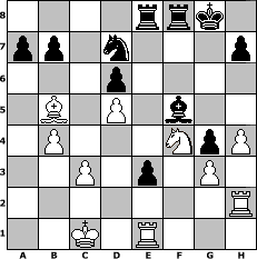 game notation in PGN-format [Event "1. Mannschaftsturnier 2004"] [Site "www.myChess.de"] [Date "2004.11.16"] [Round "2"] [Board "4"] [White "Hugo165"] [Black "Dragonwolves"] [ECO "C34"] [WhitemyELO "1518"] [BlackmyELO "1773"] [Result "1/2-1/2"] [TimeControl "10/2592000"] [WhiteDays "89"] [BlackDays "89"] [MyChessNo "8114"] 1. e4 e5 2. f4 exf4 3. Nf3 d6 4. d4 g5 5. h4 g4 6. Ng1 f5 7. Bxf4 fxe4 8. Nc3 d5 9. Be5 Nf6 10. Nxd5 Qxd5 11. Bxf6 Bb4+ 12. c3 O-O 13. Be5 Bd6 14. Bxd6 cxd6 15. g3 Qf7 16. Qe2 e3 17. Rh2 Bd7 18. O-O-O Qxa2 19. Qc4+ Be6 20. d5 Qxc4 21. Bxc4 Bf5 22. Ne2 Nd7 23. Nf4 Nc5 24. Re1 Rae8 25. b4 Nd7 26. Bb5 1/2-1/2 position notation in FEN-format 4rrk1/pp1n3p/3p4/1B1P1b2/1P3NpP/2P1p1P1/7R/2K1R3 - - - 2 26 Captured white pieces: ![]() ![]() ![]() ![]() ![]() ![]() ![]() ![]() ![]() ![]() ![]() ![]() ![]() ![]() ![]() Captured black pieces: ![]() ![]() ![]() ![]() ![]() ![]() ![]() ![]() ![]() ![]() ![]() ![]() ![]() ![]() ![]() Click on a captured piece in order to display the desired move!
