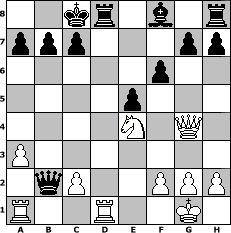 | game notation in PGN-format [Event "Mail"] [Site "www.myChess.de"] [Date "2012.05.01"] [Round "1"] [White "Winston"] [Black "ndziemba"] [ECO "C44"] [WhitemyELO "1478"] [BlackmyELO "1446"] [Result "1-0"] [TimeControl "10/864000"] [WhiteDays "10"] [BlackDays "10"] [MyChessNo "81386"] 1. e4 e5 2. Nf3 Nc6 3. a3 Nf6 4. Nc3 d5 5. exd5 Nxd5 6. Bc4 Be6 7. Qe2 f6 8. Bxd5 Bxd5 9. d4 Bxf3 10. Qxf3 Qxd4 11. Be3 Qd7 12. Ne4 O-O-O 13. O-O Nd4 14. Bxd4 Qxd4 15. Rfd1 Qxb2 16. Qg4+ 1-0 position notation in FEN-format 2kr1b1r/ppp3pp/5p2/4p3/4N1Q1/P7/1qP2PPP/R2R2K1 - - - 1 16 Captured white pieces:                              Captured black pieces:                               Click on a captured piece in order to display the desired move!