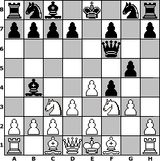 game notation in PGN-format [Event "Mit freude am Spiel 3"] [Site "www.myChess.de"] [Date "2021.09.09"] [Round "2"] [White "hsvler"] [Black "lotchi"] [ECO "C30"] [WhitemyELO "1510"] [BlackmyELO "1298"] [Result "0-1"] [TimeControl "10/1728000"] [WhiteDays "00"] [BlackDays "14"] [MyChessNo "122947"] 1. e4 e5 2. f4 Qh4+ 3. g3 Qf6 4. d3 exf4 5. Nf3 g5 6. Nc3 Bb4 0-1 position notation in FEN-format rnb1k1nr/pppp1p1p/5q2/6p1/1b2Pp2/2NP1NP1/PPP1P2P/R1BQKB1R - KQkq - 2 7 Captured white pieces: ![]() ![]() ![]() ![]() ![]() ![]() ![]() ![]() ![]() ![]() ![]() ![]() ![]() ![]() ![]() Captured black pieces: ![]() ![]() ![]() ![]() ![]() ![]() ![]() ![]() ![]() ![]() ![]() ![]() ![]() ![]() ![]() Click on a captured piece in order to display the desired move!