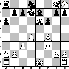 game notation in PGN-format [Event "FREUNDESTUNIER"] [Site "www.myChess.de"] [Date "2005.10.28"] [Round "1"] [White "Stecher1"] [Black "FreshPrinc2"] [ECO "C42"] [WhitemyELO "1500"] [BlackmyELO "910"] [Result "1-0"] [TimeControl "10/864000"] [WhiteDays "13"] [BlackDays "18"] [MyChessNo "18951"] 1. e4 e5 2. Nf3 Nf6 3. Nxe5 Qe7 4. d4 Nxe4 5. Qe2 Qb4+ 6. c3 Qb5 7. Qxb5 a6 8. Qe2 d5 9. f3 Nd6 10. Ng6+ Be6 11. Nxh8 Nc4 12. Nd2 Nc6 13. Nxc4 dxc4 14. Bf4 f6 15. Qxe6+ Be7 16. Bxc4 Nd8 17. Qg8+ Kd7 18. Be6+ 1-0 position notation in FEN-format r2n2QN/1ppkb1pp/p3Bp2/8/3P1B2/2P2P2/PP4PP/R3K2R - KQ - 4 18 Captured white pieces: Captured black pieces: Click on a captured piece in order to display the desired move!
