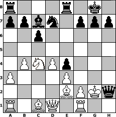 game notation in PGN-format [Event "Winter 2011/12"] [Site "www.myChess.de"] [Date "2011.12.22"] [Round "1"] [White "lasker"] [Black "Koprek"] [ECO "D37"] [WhitemyELO "1286"] [BlackmyELO "1996"] [Result "0-1"] [TimeControl "10/2592000"] [WhiteDays "50"] [BlackDays "38"] [MyChessNo "78373"] 1. d4 d5 2. c4 e6 3. Nc3 Nf6 4. Nf3 Be7 5. e3 O-O 6. cxd5 exd5 7. Be2 c6 8. O-O Bf5 9. Re1 Nbd7 10. h3 Bd6 11. a3 Re8 12. b4 Ne4 13. Nxe4 dxe4 14. Nd2 Qg5 15. Kh1 Qh4 16. Nc4 Bc7 17. Rf1 Bxh3 18. Kg1 Bxg2 19. Kxg2 Qh2# 0-1 position notation in FEN-format r3r1k1/ppbn1ppp/2p5/8/1PNPp3/P3P3/4BPKq/R1BQ1R2 - - - 1 20 Captured white pieces: Captured black pieces: Click on a captured piece in order to display the desired move!