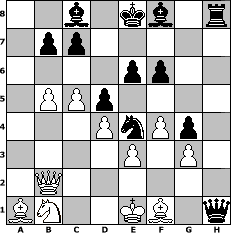 game notation in PGN-format [Event "Rechnerfrei B"] [Site "www.myChess.de"] [Date "2010.02.07"] [Round "1"] [White "nogumo"] [Black "sprinterde"] [ECO "A00"] [WhitemyELO "1611"] [BlackmyELO "1639"] [Result "0-1"] [TimeControl "10/1728000"] [WhiteDays "45"] [BlackDays "60"] [MyChessNo "63004"] 1. b4 e6 2. Bb2 Nc6 3. b5 Nce7 4. c4 a6 5. a4 axb5 6. axb5 Rxa1 7. Bxa1 d5 8. c5 Nf5 9. Nf3 Nf6 10. Qc2 Ne4 11. d4 Qf6 12. Qb2 g5 13. e3 g4 14. Ne5 Qg5 15. Be2 f6 16. Nxg4 h5 17. f4 Qh4+ 18. g3 Nfxg3 19. hxg3 Qxh1+ 20. Bf1 hxg4 0-1 position notation in FEN-format 2b1kb1r/1pp5/4pp2/1PPp4/3PnPp1/4P1P1/1Q6/BN2KB1q - KQk - 0 21 Captured white pieces: ![]() ![]() ![]() ![]() ![]() ![]() ![]() ![]() ![]() ![]() ![]() ![]() ![]() ![]() ![]() Captured black pieces: ![]() ![]() ![]() ![]() ![]() ![]() ![]() ![]() ![]() ![]() ![]() ![]() ![]() ![]() ![]() Click on a captured piece in order to display the desired move!