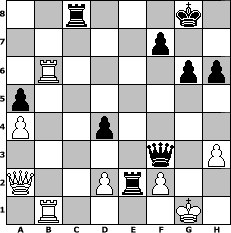 game notation in PGN-format [Event "LASKER 2016/1916"] [Site "www.myChess.de"] [Date "2016.10.26"] [Round "1"] [White "miu"] [Black "martinus"] [ECO "D57"] [WhitemyELO "1550"] [BlackmyELO "1757"] [Result "0-1"] [TimeControl "10/2592000"] [WhiteDays "084"] [BlackDays "119"] [MyChessNo "105429"] 1. d4 d5 2. c4 e6 3. Nc3 Nf6 4. Bg5 Be7 5. e3 O-O 6. Nf3 h6 7. Bh4 Ne4 8. Bxe7 Qxe7 9. cxd5 Nxc3 10. bxc3 exd5 11. Bb5 c6 12. Bd3 Bg4 13. O-O Nd7 14. h3 Be6 15. a4 a5 16. Qc2 Qf6 17. Rab1 b6 18. Rb2 Rfe8 19. Kh2 Rac8 20. Rfb1 g6 21. c4 c5 22. cxd5 Bxd5 23. e4 Qf4+ 24. Kg1 Bxe4 25. Qc4 Bxf3 26. gxf3 cxd4 27. Qa2 Ne5 28. Be4 Nxf3+ 29. Bxf3 Qxf3 30. Rxb6 Re2 0-1 position notation in FEN-format 2r3k1/5p2/1R4pp/p7/P2p4/5q1P/Q2PrP2/1R4K1 - - - 1 31 Captured white pieces: Captured black pieces: Click on a captured piece in order to display the desired move!
