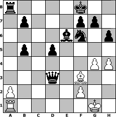 game notation in PGN-format [Event "Spa"] [Site "www.myChess.de"] [Date "2010.05.28"] [Round "1"] [White "Hobbykegler"] [Black "Master1"] [ECO "D00"] [WhitemyELO "1116"] [BlackmyELO "1332"] [Result "0-1"] [TimeControl "10/2592000"] [WhiteDays "28"] [BlackDays "28"] [MyChessNo "65792"] 1. d4 d5 2. c3 Nf6 3. h3 Nc6 4. g4 h6 5. Bg2 e5 6. dxe5 Nxe5 7. Nf3 Nxf3+ 8. Bxf3 c6 9. O-O Bc5 10. b4 Bb6 11. e3 Be6 12. Re1 a6 13. Ba3 O-O 14. b5 axb5 15. Bxf8 Kxf8 16. Na3 Qd6 17. e4 Qxa3 18. exd5 cxd5 19. Qd2 Ba5 20. h4 Bxc3 21. Qd3 Bxa1 22. Rxa1 Qxd3 0-1 position notation in FEN-format r4k2/1p3pp1/4bn1p/1p1p4/6PP/3q1B2/P4P2/R5K1 - - - 0 23 Captured white pieces: Captured black pieces: Click on a captured piece in order to display the desired move!