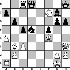 game notation in PGN-format [Event "1700er"] [Site "www.myChess.de"] [Date "2012.04.20"] [Round "2"] [White "neoprogtroll"] [Black "martinus"] [ECO "B20"] [WhitemyELO "1768"] [BlackmyELO "1720"] [Result "1-0"] [TimeControl "10/864000"] [WhiteDays "35"] [BlackDays "25"] [MyChessNo "81227"] 1. e4 c5 2. Na3 Nc6 3. c3 Nf6 4. d3 d5 5. exd5 Nxd5 6. Nf3 e5 7. Nc4 f6 8. Be2 Be7 9. O-O O-O 10. Qb3 b6 11. Re1 Bf5 12. Nfd2 Be6 13. Bf3 Rb8 14. a4 Nc7 15. Bxc6 Qxd3 16. Be4 Qd8 17. Qd1 f5 18. Bc2 e4 19. f3 exf3 20. Qxf3 Bd5 21. Qh3 g6 22. Ne5 Bf6 23. Ndf3 Re8 24. Qg3 Bxf3 25. Nxf3 Rxe1+ 26. Nxe1 Bh4 27. Bb3+ Kg7 28. Qe3 Bf6 29. Qh6+ Kh8 30. Bf4 Bg7 31. Qh3 Rc8 32. Nf3 Nd5 33. Ng5 h6 34. Nf7+ 1-0 position notation in FEN-format 2rq3k/p4Nb1/1p4pp/2pn1p2/P4B2/1BP4Q/1P4PP/R5K1 - - - 1 34 Captured white pieces: Captured black pieces: Click on a captured piece in order to display the desired move!