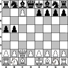 game notation in PGN-format [Event "Trainingslager II"] [Site "www.myChess.de"] [Date "2011.05.24"] [Round "2"] [White "Duschgel"] [Black "micha62"] [ECO "A10"] [WhitemyELO "1571"] [BlackmyELO "1165"] [Result "1-0"] [TimeControl "10/1728000"] [WhiteDays "20"] [BlackDays "00"] [MyChessNo "74143"] 1. c4 d5 2. cxd5 c5 3. dxc6 b5 4. Qc2 a5 5. c7 1-0 position notation in FEN-format rnbqkbnr/2P1pppp/8/pp6/8/8/PPQPPPPP/RNB1KBNR - KQkq - 0 5 Captured white pieces: Captured black pieces: Click on a captured piece in order to display the desired move!