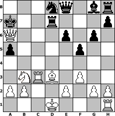 game notation in PGN-format [Event "Wems gef"] [Site "www.myChess.de"] [Date "2006.01.13"] [Round "2"] [White "reisinger"] [Black "MichaelKnopf"] [Variant "Fischerrandom"] [SetUp "1"] [FEN "nbrkqnbr/pppppppp/8/8/8/8/PPPPPPPP/NBRKQNBR w KQkq - 0 1"] [WhitemyELO "1373"] [BlackmyELO "1469"] [Result "1-0"] [TimeControl "10/864000"] [WhiteDays "10"] [BlackDays "10"] [MyChessNo "21664"] 1. f3 Nb6 2. c4 c5 3. Nb3 d6 4. Rc3 f6 5. Ne3 Ne6 6. Be4 Rc7 7. Na5 Kc8 8. Nb3 g6 9. Nd5 Nxd5 10. Bxd5 b6 11. Be3 Nd8 12. Qf2 e6 13. Be4 a5 14. d4 d5 15. cxd5 f5 16. d6 Rd7 17. Bd3 Bxd6 18. dxc5 bxc5 19. Bxc5 Bxc5 20. Qxc5+ Kb8 21. Qc8+ Ka7 22. Qa6+ 1-0 position notation in FEN-format 3nq1br/k2r3p/Q3p1p1/p4p2/8/1NRB1P2/PP2P1PP/3K3R - K - 4 22 Captured white pieces: Captured black pieces: Click on a captured piece in order to display the desired move!
